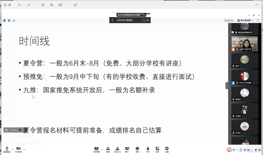 接着,蒙延起学长主要介绍了保研的基本流程。其主要分为6月末到8月的夏令营,9月中下旬的预推免和9月正式推免。学长强调在准备夏令营材料的时候,要准备好自己的个人资料,主要是一些成绩排名、获奖经历以及四六级成绩等。学长也提了一些个人的建议,他认为我们最好要有保底的学校,因为有的学校发的夏令营offer没有效力。同时,他也强调到我们心态不要过分紧张,然后如果答应了对方学校,就尽量不要食言,以及我们在准备保研的同时也要准备一些考研的科目,以备无患。