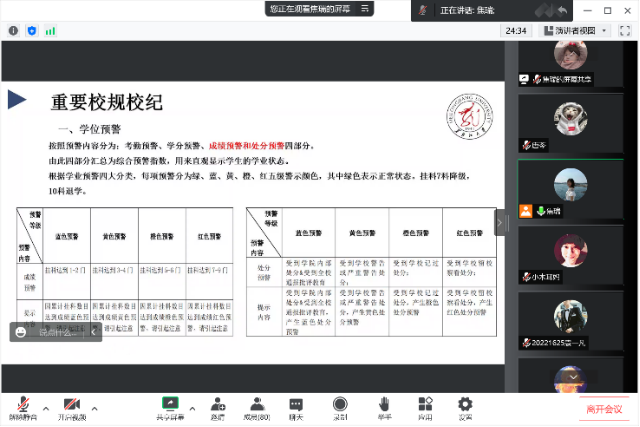 会议第二项,焦老师强调重要的校规校纪。焦老师重点强调“学位预警、违禁电器、请假与考勤制度”三方面,目的是让同学们提前了解学校的规章制度并帮助同学们尽快适应大学生活。希望同学们能够自觉遵守校规校纪,强化自我管理、自我服务意识,同时也是为了确保同学们的在校安全。