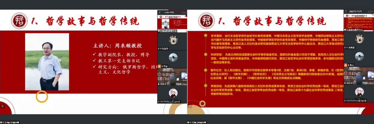 周来顺老师以《哲学故事与哲学传统》为主题, 以“哲学系是包容的、有温度的、哲学的、有未来的”为核心展开讲解。周老师以自身求学经历为例,因为不太了解专业所学内容最初报考不是哲学专业,因本科期间很多课程都是和哲学专业一起上,使他对哲学产生了极大的兴趣,哲学专业的教师对他的欢迎和哲学系包容开放的情怀,深深感动了周老师,因此是包容的哲学系;在周老师从校园走进社会遇到困难时,哲学系的老师都伸出援手,帮助周老师渡过难关,让周老师感受到哲学系的人文情怀,因此是有温度的哲学系;美剧天堂