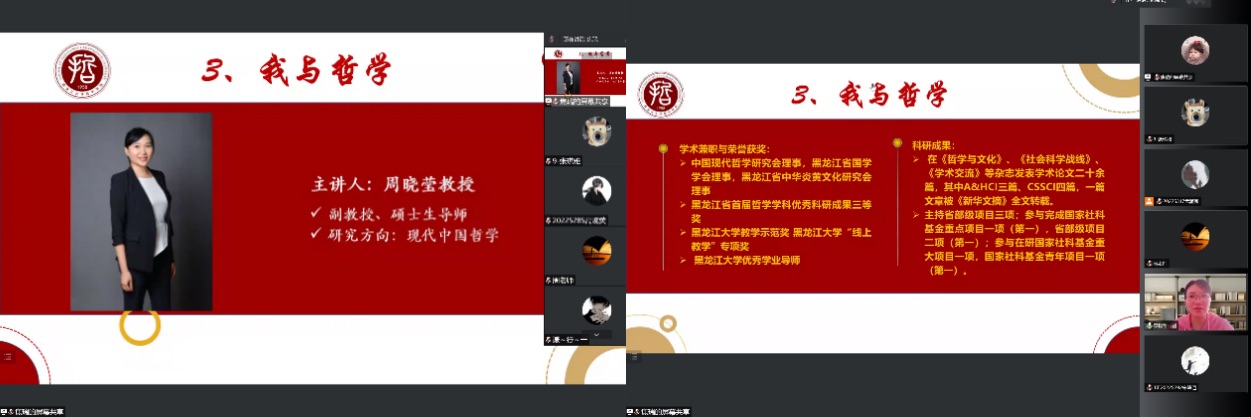 ,讲述了自己从机缘巧合来到黑大学哲学,面对现实与理想的落差,经过本科阶段的学习,在众多学科中选择了中国哲学后一直走在研究中国美学的路上的求学历程。在进入社会面临众多选择时,张灵馨老师表达了她的择业观,即:不以赚钱为目的,更注重自己能不能继续坚持自己所热爱的研究方向,直面客观上的差距和压力,做出自己的选择。张灵馨老师认为目前全国都在发展建设,城市之间的差距没有那么大,也受到家人想建设家乡的影响,选择留在哈尔滨。