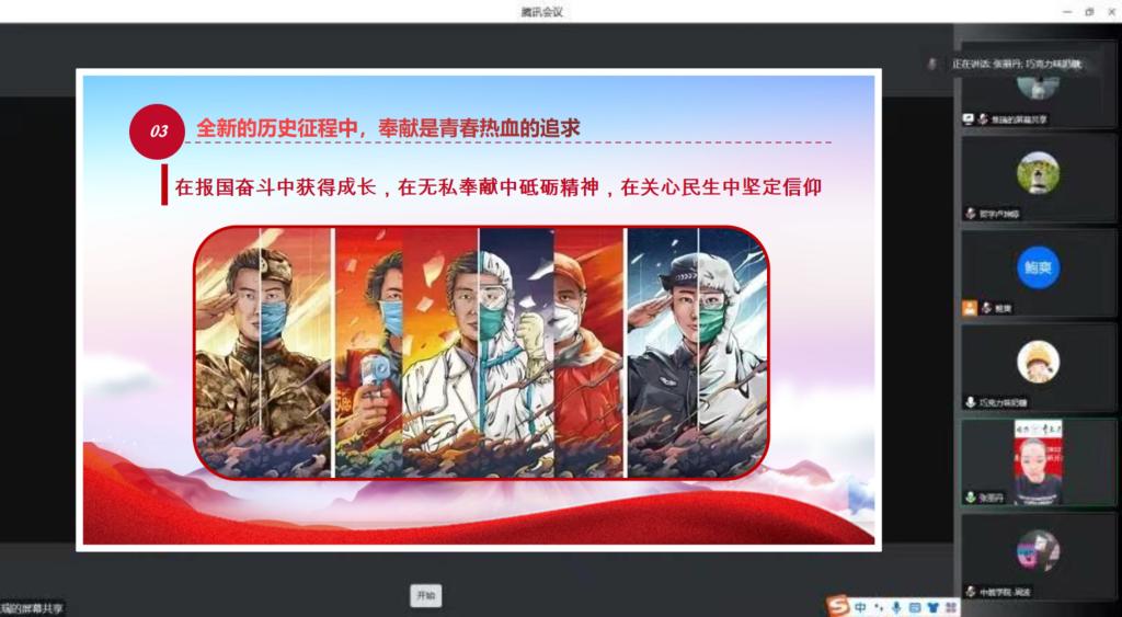 第三章节主题为“奉献是青春热血的追求”。百年时光飞逝,张老师的讲述也已经推进到了21世纪。对于新世纪的青年来说,全新的历史征程中,奉献是青春热血的追求。新冠疫情来临之际,新一代青年人勇担大任,以实际行动证明了新一代青年人的责任与担当。脱贫攻坚中,新一代青年勇往直前,以青年的热血与智慧,为这场没有硝烟的战争注入了新鲜力量。张老师强调,要让青春之花绽放在祖国最需要的地方。