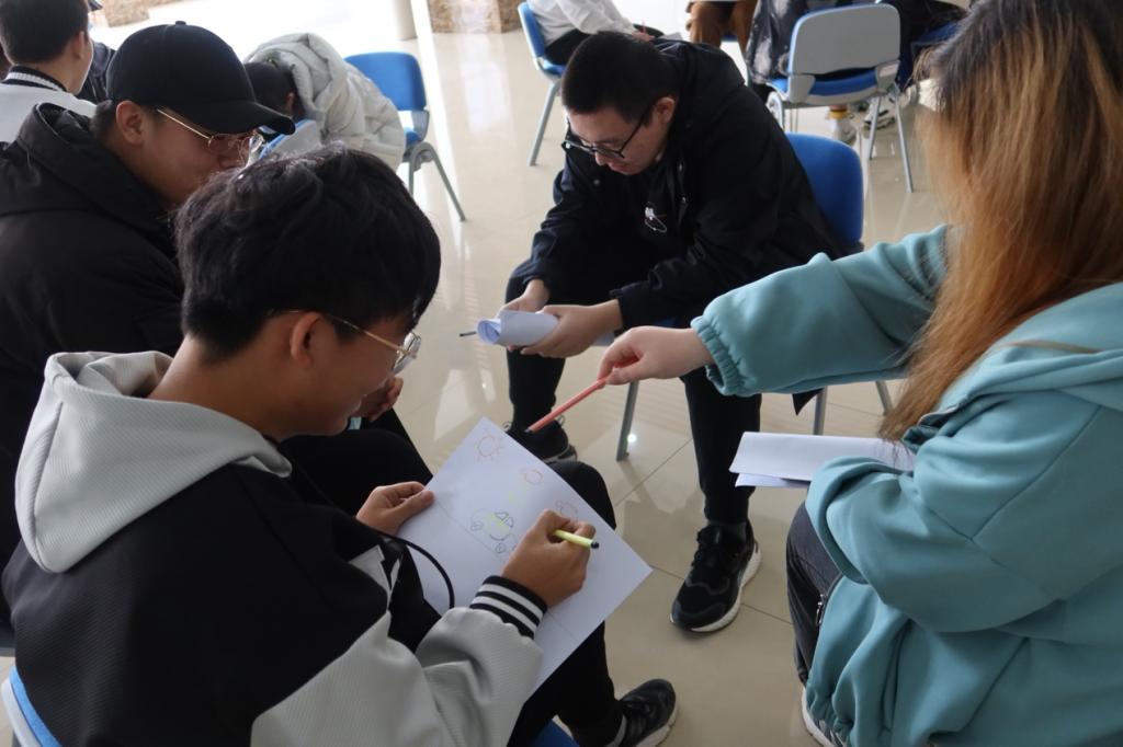 老师将同学们进行简要的分组,同学们以小组为单位进行无交流作画。同组的同学们在未经交流的情况下共同创作一幅画,完成后每个组派一名代表对作品进行介绍。整个活动加深了同学们之间的理解与沟通,增强班级同学间的默契与和谐,提升了班级的凝聚力。