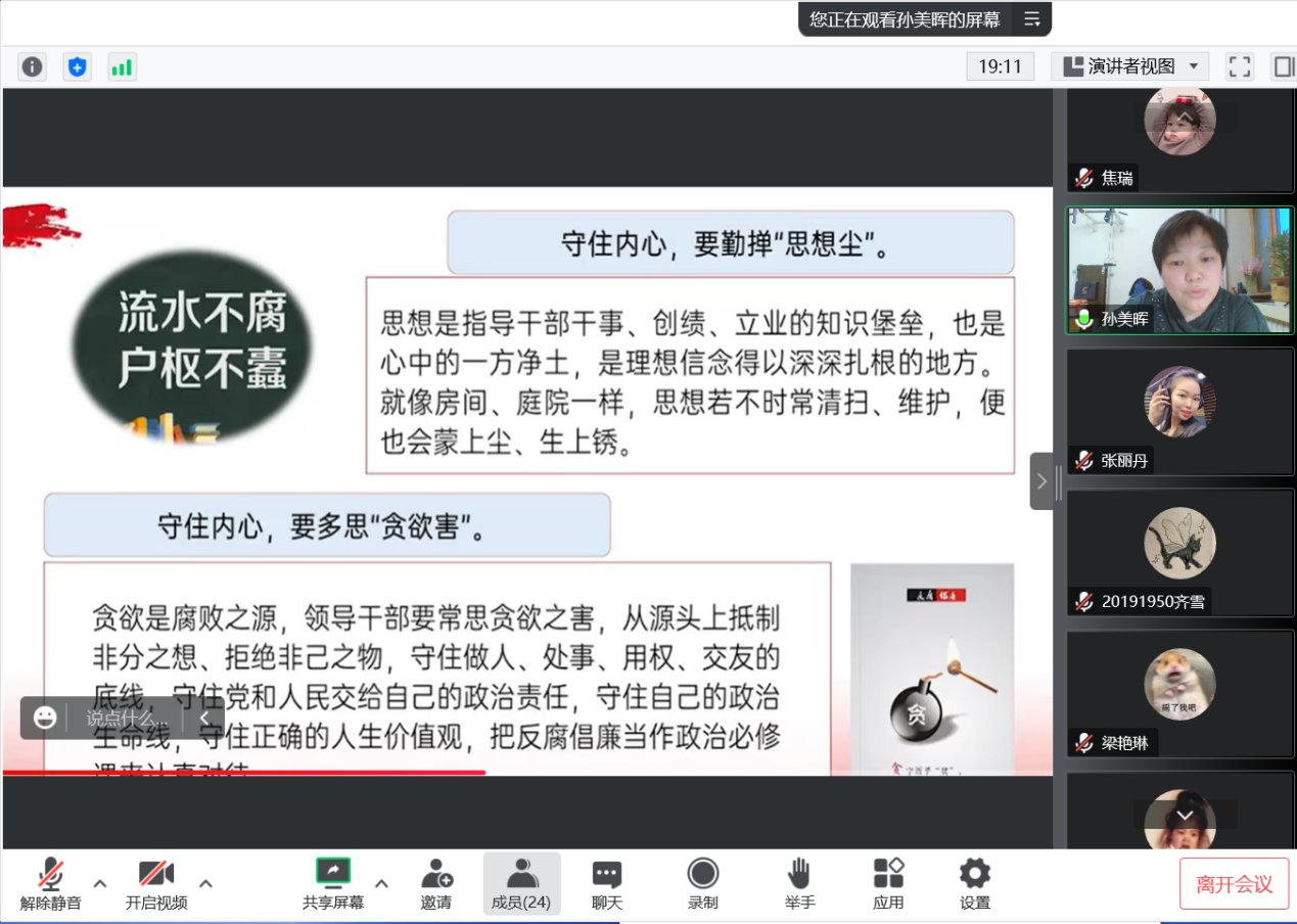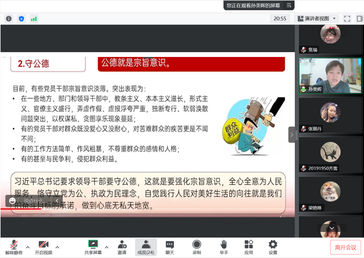 孙美晖书记主讲了主题为“新时代大学生廉洁文化自我修养”的党课,孙书记从文件入手讲解了廉洁教育的重要意义,向各位学生党员介绍了中共中央《关于加强新时代廉洁文化建设的意见》的内容与精神,指出廉洁文化是以廉洁为基本要求,以思想观念、价值取向、行为规范为主要内容,以廉洁政治为目标形成的文化总和,并强调正心修身、涵养文化,才能守住为政之本。