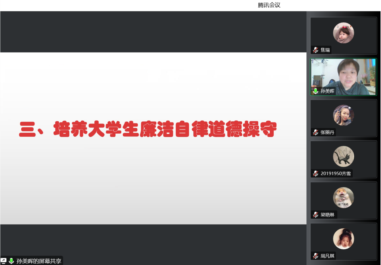 孙书记从三个部分开展讲解,即加强新时代大学生廉洁教育的必要性和紧迫性、夯实清正廉洁的思想根基、培养大学生廉洁自律道德操守。第一方面,新时代大学生廉洁教育的必要性和紧迫性。大学生作为社会的重要组成部分,是最有影响力的社会群体之一,是社会主义建设者和接班人。对大学生进行廉洁教育不仅是高校思想政治教育工作的重要内容,更对大学生个人的健康成长和全面发展,对中国特色社会主义事业的发展以及中华优秀传统文化的继承具有十分重要的作用。新时代大学生要以习近平新时代中国特色社会主义思想武装头脑,增强“四个意识”、坚定“四个自信”、做到“两个维护”,以理想信念强基固本。