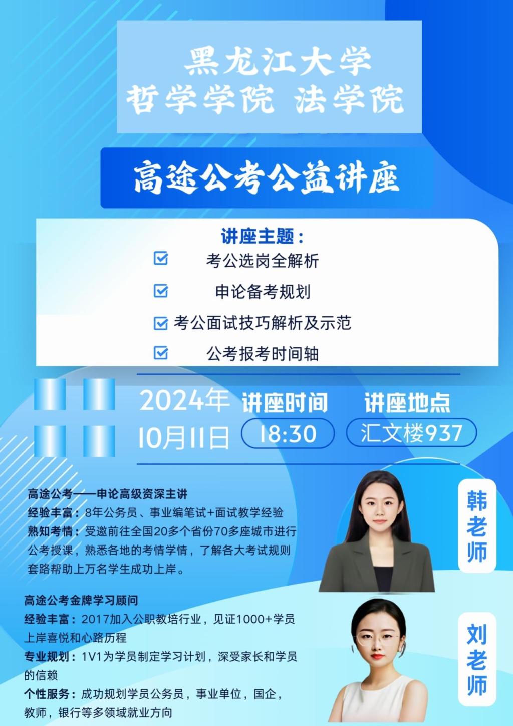 、法学院于10月11日18:30在汇文楼937举办公考指导公益讲座,特邀高途教育的刘老师和韩老师,给同学们带来权威的公考指导和经验分享。