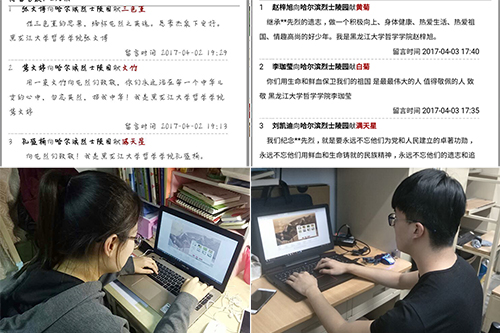 在“网上祭英烈”活动中,同学们积极响应号召,在假期期间登录并浏览哈尔滨烈士陵园网站,怀着敬仰之情学习英烈事迹,缅怀先烈。革命先烈们强烈的爱国主义精神深深地打动着每一位同学,汪亚臣、朱瑞、陈翰章、卢冬生、刘富贵……一位位英烈的名字在同学们的心中回响,他们的英雄事迹深深地镌刻在同学们的心中。同学们在留言区纷纷留言献花,用文字寄托哀思,表达敬意,在网上为英雄扫墓,祭奠英灵。