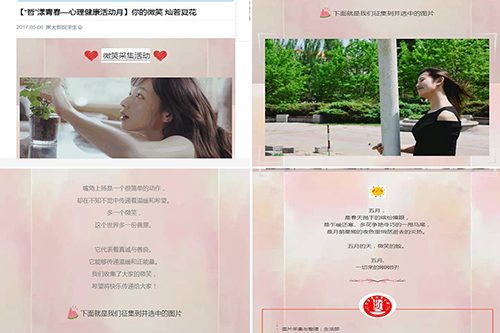 微笑是人最美好的部分,代表着真诚与善的微笑是展示个人的一种方式,能够带给人们温暖和正能量。学院学生会面向全体同学发出了采集微笑照片的倡议和邀请,并将其发布在学院微信公众平台上,将快乐的信念和关注心理健康的理念传播出去。邀请发出之后,同学们积极响应,纷纷将最美的笑容用照片定格。截止2017年4月29日,活动共收到同学们的微笑照片百余张。在上传的微笑照片中,有劳动中的微笑、有感动中的微笑、有关怀的微笑……一张张微笑照片透露出来的是同学们心理积极向上、阳光快乐的内心世界。经过筛选,有十余张经典、具有代表性的照片被推送在美剧天堂