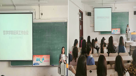 会议开始前,现场播放了征兵宣传片,通过宣传片,同学们初步的了解了征兵的相关政策。随后,黄影老师从组织领导、征集的对象及条件、征集程序和办法、宣传发动教育、有关政策规定等几个方面对学校政策方案进行了全面细致的解读。黄影老师着重强调了男性大学生参军年龄,并对身体条件和政治要求作了说明,让同学们更加明确自己是否符合条件。接下来,黄影老师专门讲解了征集程序和办法,她提醒同学们注意时间节点,不要错过时间。同时,老师还依据往年的征兵政策向大家大体介绍了大学生征兵的相关政策,如入伍前的“优先征集”政策,服役期间的有关就学政策,入伍后培养使用问题,服役期间优抚安置和有关工资补助问题等。最后,黄影老师对同学们的疑惑和不解的问题再次作了细致回答,指出国家一系列政策措施免除了同学们参军入伍的后顾之忧,鼓励有志学生积极报名,报效祖国。