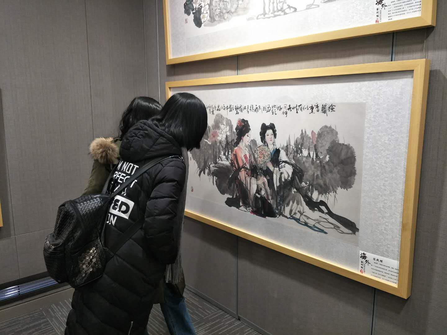 在王秋老师的带领下,同学们来到一楼大厅,跟随讲解员的脚步,同学们看到了栩栩如生的玉雕和风格迥异的壁画,同学认真聆听讲解仔细欣赏艺术品。参观完一楼展品之后,同学们来到二楼的海外艺术馆。二楼展览品共分为书法绘画和瓷器两部分,根据讲解员的讲解,海外艺术馆收藏的书法绘画作品大多出自当代名家之手,它们风格迥异,从“正襟危坐”的哈士奇到“稻田姑娘”,作品形式丰富多彩。