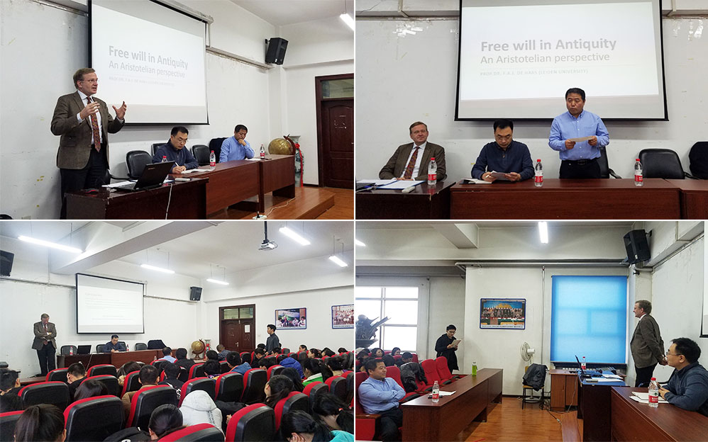 汉斯教授长期从事于古代和中世纪哲学的研究,致力于对柏拉图、亚里士多德和苏格拉底思想的研究,且集中研究亚里士多德关于科学哲学的观点。他从“我们真的是自由的吗?”这一问题出发,列举了决定论和非决定论对自由的定义,并对二者的观点进行了比较分析,进一步提出我们的自由受内在因素和外在因素的限制。紧接着,汉斯教授列举了亚里士多德和斯多葛学派的观点,在亚里士多德看来,道德责任是决定自由意志的外在因素,人自身的情绪和欲望是内在因素;而斯多葛学派认为,神是外在因素,人自身的道德、德性则是内在因素。通过对亚里士多德和斯多葛学派的观点的对比,汉斯教授详细地对他们的不同加以解释。汉斯教授总结道,古代哲学家们分析了行动自由、深思熟虑和选择自由的概念,目的是以此来维护道德责任。最后,汉斯教授与老师和同学们就讲座内容进行了探讨,同学们踊跃发言,提出了自己对于自由的理解和看法,汉斯教授对同学们的看法进行了交流讨论。