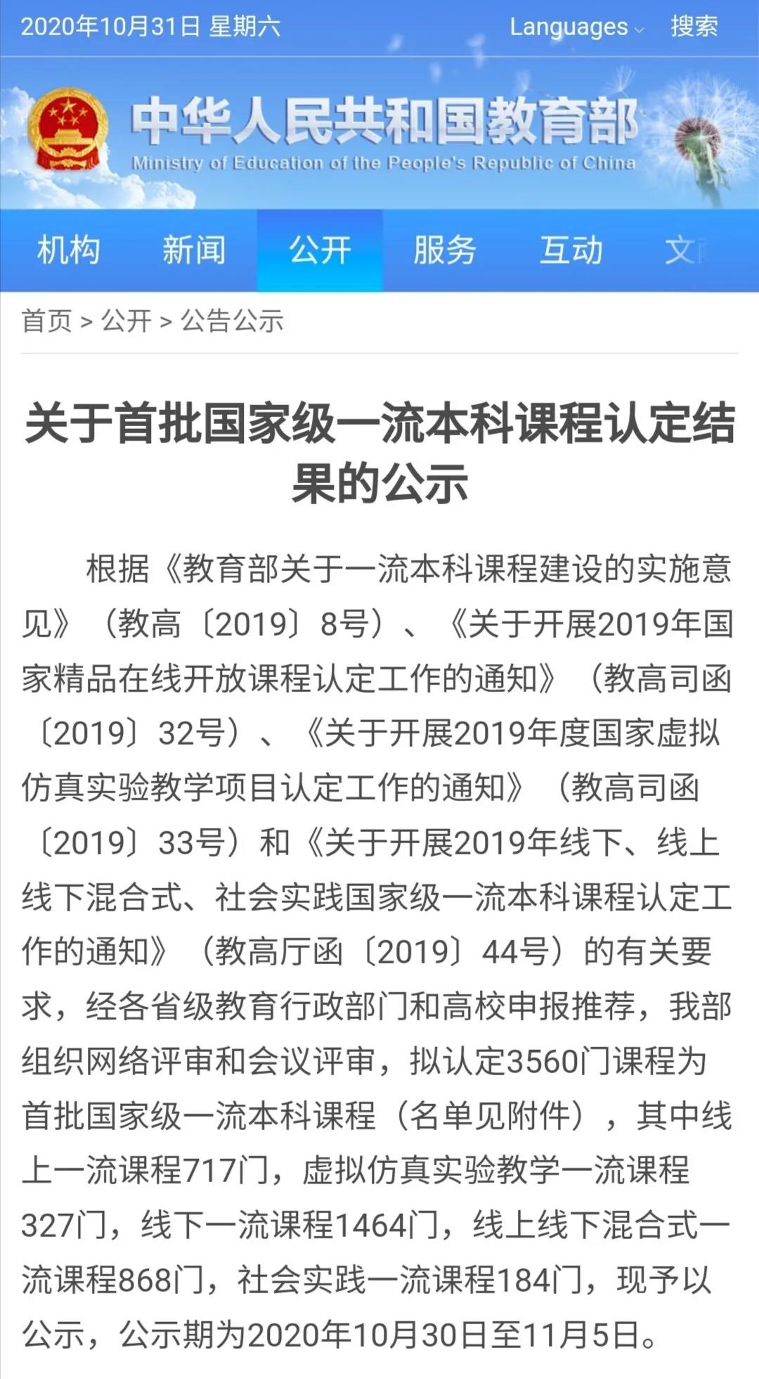 根据《教育部关于一流本科课程建设的实施意见》(教高〔2019〕8号)、《关于开展2019年国家精品在线开放课程认定工作的通知》(教高司函〔2019〕32号)、《关于开展2019年度国家虚拟仿真实验教学项目认定工作的通知》(教高司函〔2019〕33号)和《关于开展2019年线下、线上线下混合式、社会实践国家级一流本科课程认定工作的通知》(教高厅函〔2019〕44号)的有关要求,经各省级教育行政部门和高校申报推荐,教育部组织网络评审和会议评审,以美剧天堂