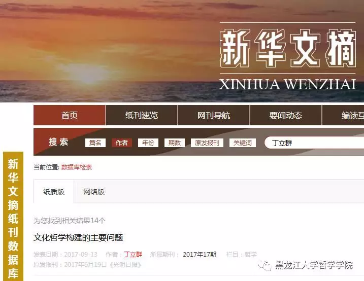 《新华文摘》作为大型理论性、综合性、资料性文摘类权威期刊,以其思想性、学术性、权威性和可读性享誉海内外,是我国最具影响的哲学社会科学文摘类杂志。其转载和摘编的哲学社会科学领域的新观点、新资料、新方法和文艺佳作的学术价值不言而喻。此次,《文化哲学建构的主要问题》一文的全文转载已是丁立群教授的文章第14次被《新华文摘》全文转载或论点摘编。