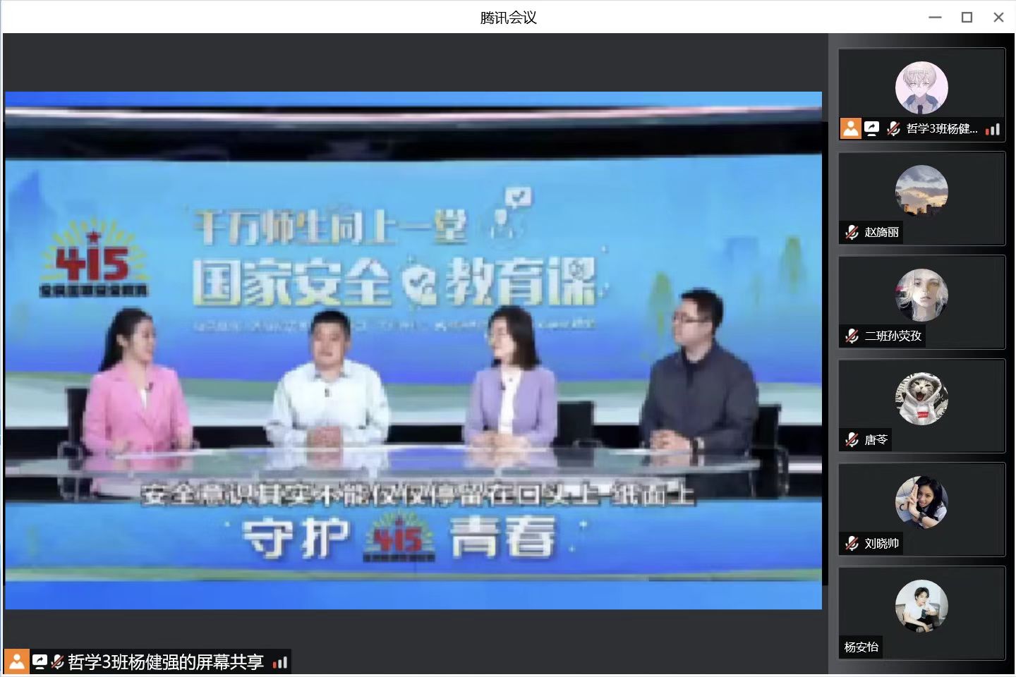 首先,学院各年级同学积极学习了“同上一堂安全教育课”直播课。该公开课视频由北京大学保卫部部长赵冠英、腾讯守护者计划安全专家张文涛、山东大学辅导员薛冰、北京师范大学2019级本科生刘懿莹联合分享。随着时代发展,出现了一些不断地危及着社会的发展和进步的现象,安全教育的普及已经迫在眉睫。公开课为我们讲解了一些案例,展现了一些反面教材,告诉我们要维护国家安全,提高自我安全防范意识,要牢固树立国家安全观。