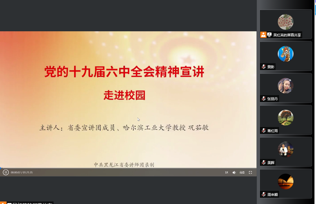 理论学习中心组成员共同观看了直播宣讲—《党的十九届六中全会精神宣讲走进校园》。此次直播宣讲由省委宣讲团成员、哈尔滨工业大学教授巩茹敏讲授。巩教授从党的十九届六中全会的总体概况、十九届六中全会涵盖的主要内容、十九届六中全会彰显的新的亮点、特点以及十九届六中全会给予我们的思考与启示等四个方面进行了宣传讲授。大家观看直播宣讲后,结合自身工作实际进行了热烈讨论。