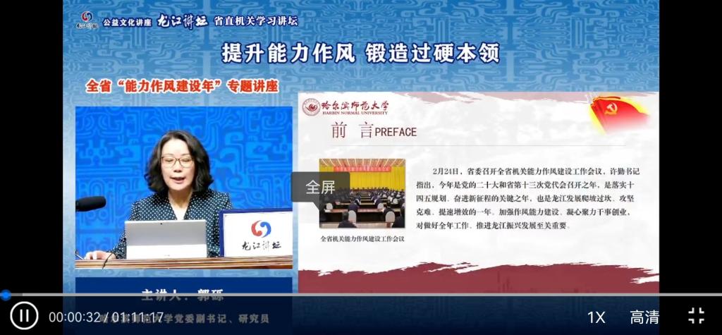 该讲座由哈尔滨师范大学党委副书记、中国妇女研究会理事、中国残疾人事业研究会理事、黑龙江省女性学研究会副理事长郭砺研究员主讲。她从抓好能力作风建设的重大意义、加强机关能力建设的总体安排、推动机关能力作风建设的工作任务和强化机关能力作风建设的组织领导等四个方面进行了宣讲。