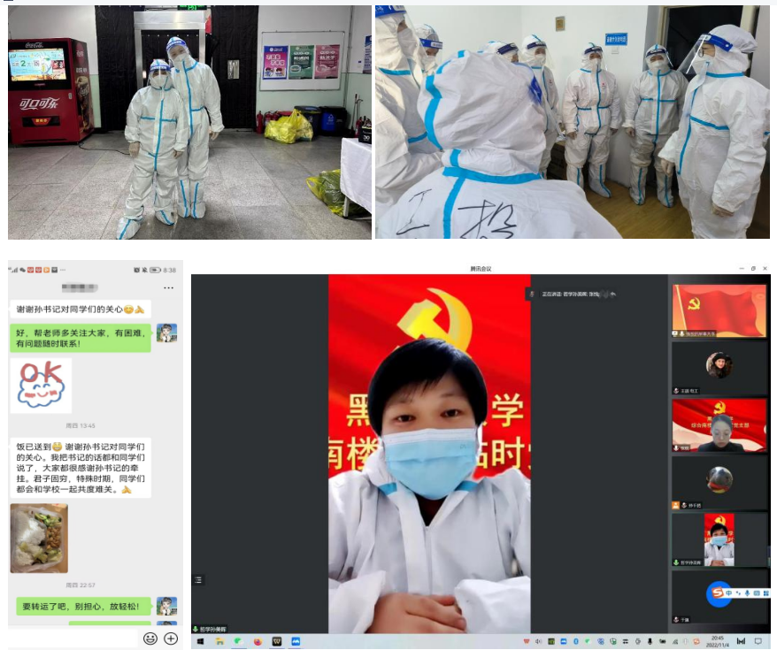 党员领导干部靠前指挥,教工队伍深入一线,时刻关注着师生身体健康安全,关心关注师生思想政治教育,加强人文关怀,引导师生加强自我防护,做好深入细致的心理疏导工作。我院辅导员张博伦老师承担协助学校防控物资转运发放、隔离学生转运、住校工作人员核酸检测信息录入等工作,同时主动细致掌握学生情况,做好学生关注疏导与帮扶,帮助学生协调解决困难和问题。辅导员焦瑞老师驻守留校学生宿舍楼全天候24小时在线,逐门逐户询问学生需求及感受,常常关注学生关切问题和困难,有问必答,有需必应,有难必解。及时引导回应,不断展现疫情下的黑大温度。在学院党总支的有力号召下,学院学生党员干部也焕发了独属于他们的青春光彩。每日天还未亮,美剧天堂