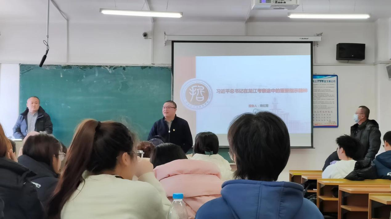蒋红雨就高质量发展这个首要任务进行了深入阐释,从牢牢把握黑龙江在国家发展大局中的战略定位,扭住高质量发展这个首要任务,以及如何落实好党中央关于推动东北全面振兴的决策部署,扬长补短,把资源优势、生态优势、科研优势、产业优势、区位优势转化为发展新动能新优势等方面进行了论述。在讲授过程中他引导广大学子深刻领会习近平总书记重要讲话、重要指示的丰富内涵和实践要求,激励大家切实做到学思用贯通、知信行统一,做到真学、真懂、真信、真用,把习近平总书记重要讲话重要指示精神落到实处,用理论知识武装头脑,用青春力量推进强国建设。