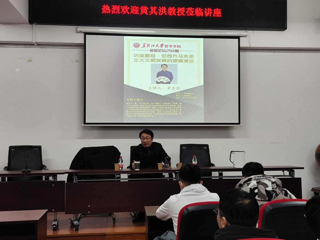 李昕桐教授首先对黄其洪教授的到来表示热烈欢迎和衷心感谢,并对黄其洪教授的研究方向和学术经历及其学术成果作了简要介绍。她指出,黄其洪教授长期从事马克思与德国古典哲学、马克思与西方实践哲学传统、当代激进左翼、移民现象学等领域研究,学术成果颇丰,在国内享有一定的学术声誉。随后,黄其洪教授从西方马克思主义的发展分期出发,对西方马克思主义的历史逻辑进行了具体的阐发。黄其洪教授通过对经典文本的分析,清理西方马克思主义三期发展的历史脉络,分析每一期发展的基本特征、历史背景和思想背景,剖析由第一期发展到第二期的原因,再分析由第二期向第三期发展的原因。在此基础上,重点介绍了第三期发展的现状和趋势,同时也讨论了国内西方马克思主义研究与第三期的关系,为学生全面勾勒出西方马克思主义发展的整体图景。