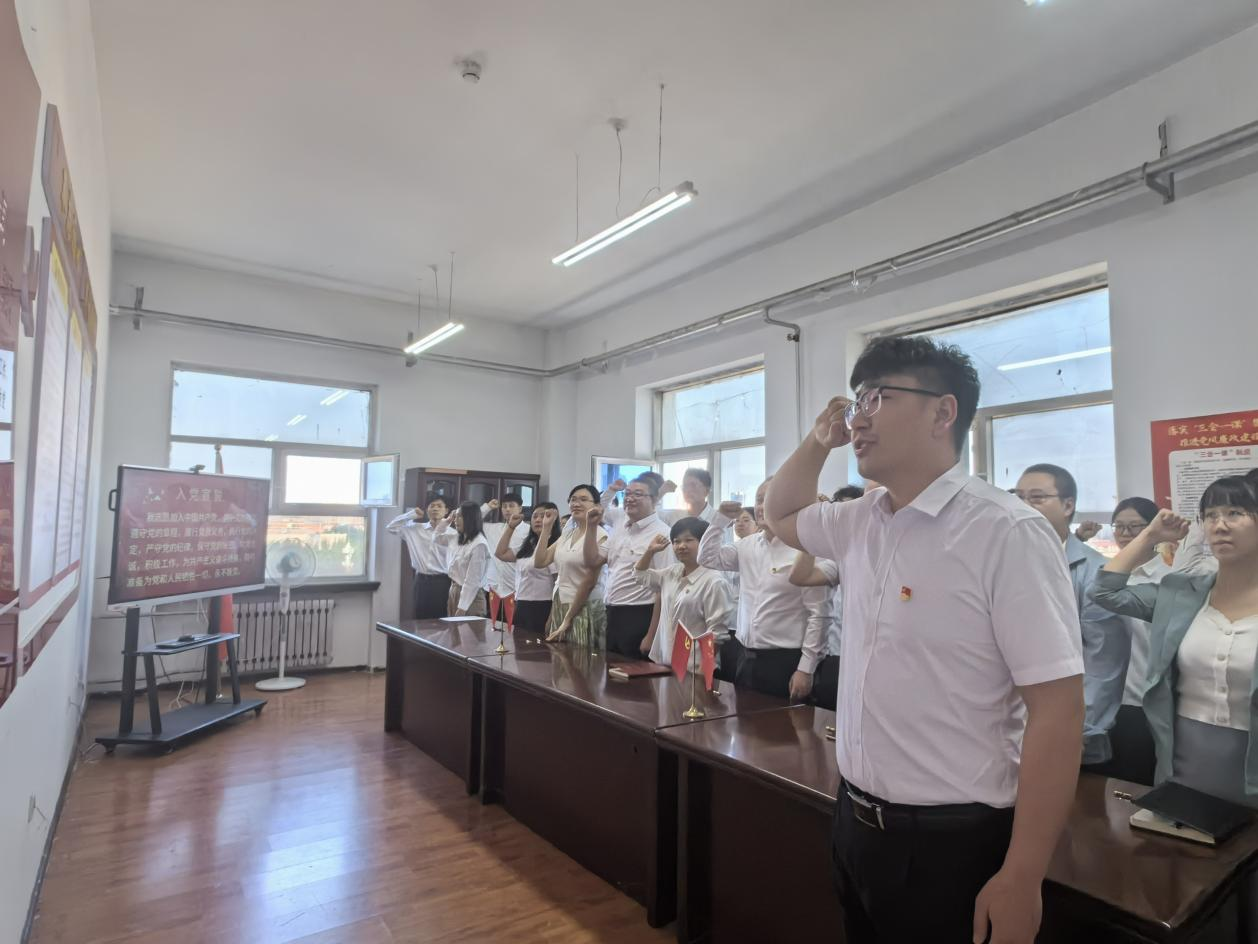 活动第二项,宣读入党誓词、佩戴党员党徽。在领誓人的带领下,教师老党员们和学生新党员们一同面向党旗,整齐列队,宣读誓词,声音洪亮而坚定。他们用誓言表达了对党的忠诚和为共产主义事业奋斗终身的决心。紧接着,由教师老党员们为学生新党员们佩戴党员党徽,这一刻岁月的沉淀与青春的活力交汇,责任与使命在无声中传递。
