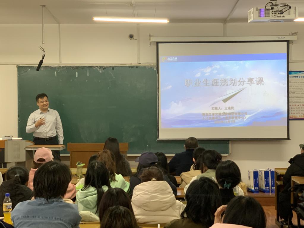 王连民主任围绕省交投集团基本情况、职业生涯规划的重要性与必要性、大学生的职业选择以及综合素质能力提升建议等方面,结合实际案例,以幽默风趣的语言为学院学生讲授了职业生涯规划分享课。王连民主任结合自身职业生涯与工作经历与同学们进行了深入细致的“互动式”交流,就同学们关心关注的问题进行了耐心细致的解答,并对同学们提出了建议与希望。