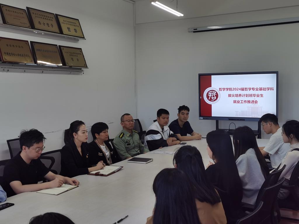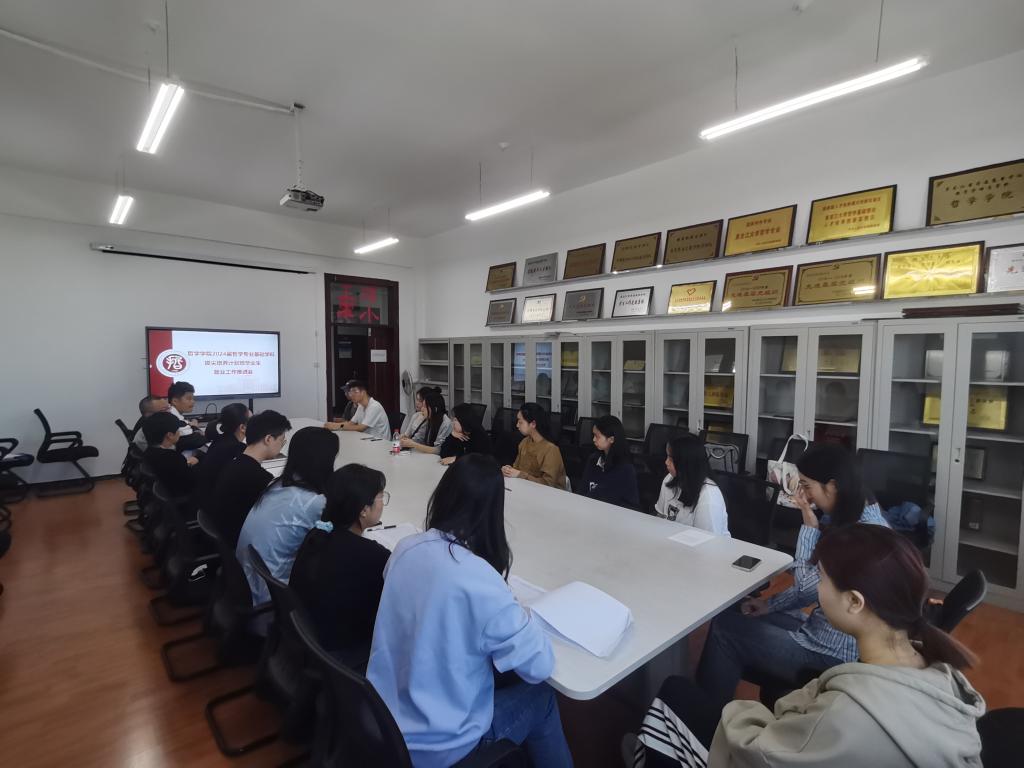 于2023年9月15日上午在汇文楼922会议室召开2024届哲学专业基础学科拔尖培养计划班毕业生就业工作推进会议,学院党总支书记孙美晖、党总支副书记张丽丹、正处级辅导员孙庆斌、2024届辅导员张博伦以及2024届哲学专业基础学科拔尖培养计划班全体学生参加大会。